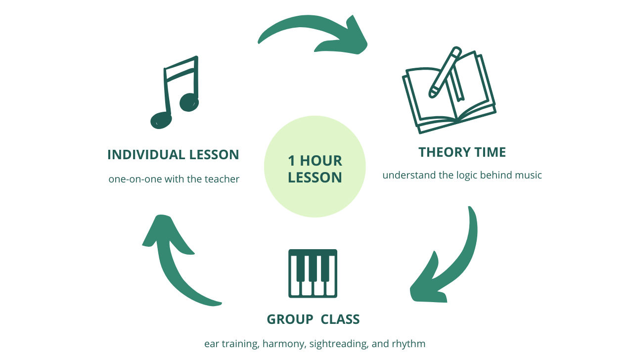 For late beginners in book two, students can have an hour lesson with two students in the class. For intermediate to advanced students, the hour consists of a thirty minute individual lesson and a thirty minute theory lab. Students at the late beginner level are expected to practice 100 minutes per week, and intermediate students are expected to practice 3 hours per week.